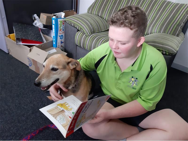 Jack sits with Dean Carstensen he reads the Husky Adventure. Photo: Supplied