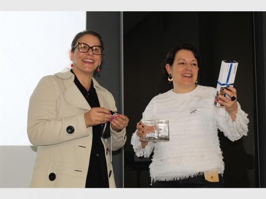 Tanya Pampalone and Think Ahead managing director, Michelle Lissoos give away prizes to the audience after a raffle. Photo: Itumeleng Komana