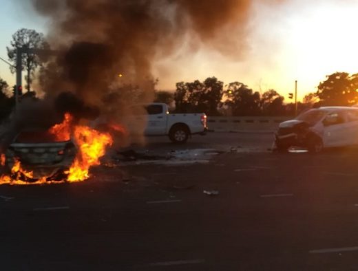 Netcare 911 spokesperson Shawn Herbst said, “Reports from the scene indicate that two vehicles were involved in a collision resulting in one of the vehicles catching alight and burning out completely.”