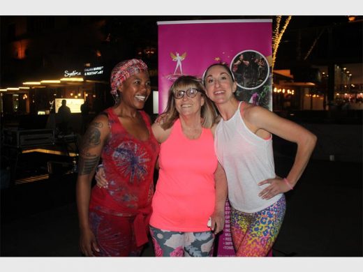 Seipei Mashugane, Adrienne Eclelsteir and Kerri Katz happy to entertain the audience with fitness exercise at Light up the Night. Photo: Gift Tlou
