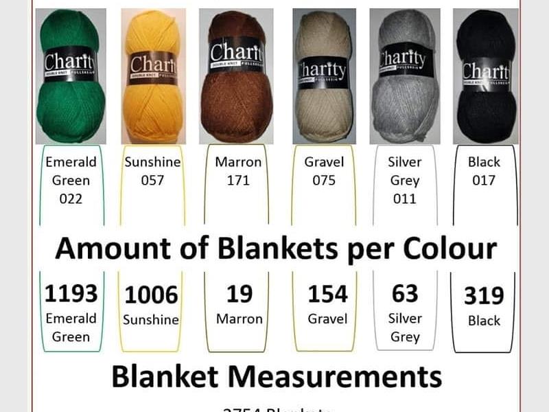 The Blankets for the 67 Blankets for Mandela Day Challenge must be the following colours: emerald green 002 (need 1 193), sunshine 057 (need 1 006), marron 171 (need 19 blankets), silver-grey 011 (need 63 blankets) and black 017 (need 319).