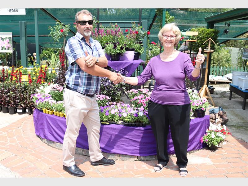 Reea manager Alex Sheffield shakes hands with Reea bookshop founder Judy Harding at a beautiful purple flower display at the Colourful Splendor Nursery in Craighall Park. Photo: Sarah Koning