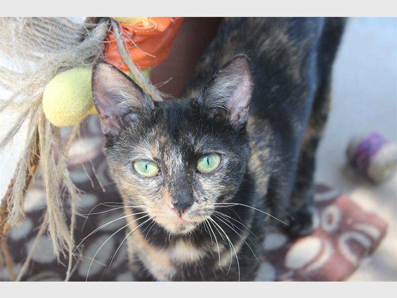 Cleo is a one-year-old female dark tortoiseshell domestic shorthair. Cattery 2.