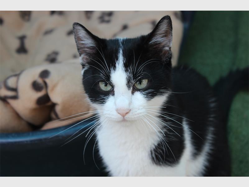 Jake is nine-month-old male black and white domestic short hair. Cattery 3.