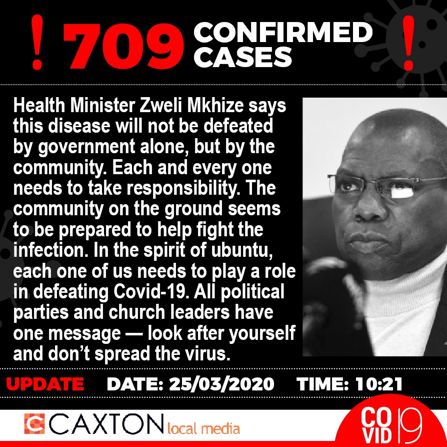 Confirmed Covid-19 cases have increased to 709 in South Africa, with 64 more cases in Gauteng.