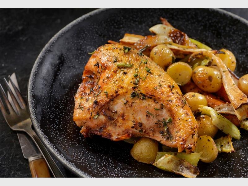 2. Heat oil in a medium saucepan over medium heat. Brown chicken pieces by cooking them for 3–4 minutes per side. Remove from saucepan and place chicken into a roasting pan.