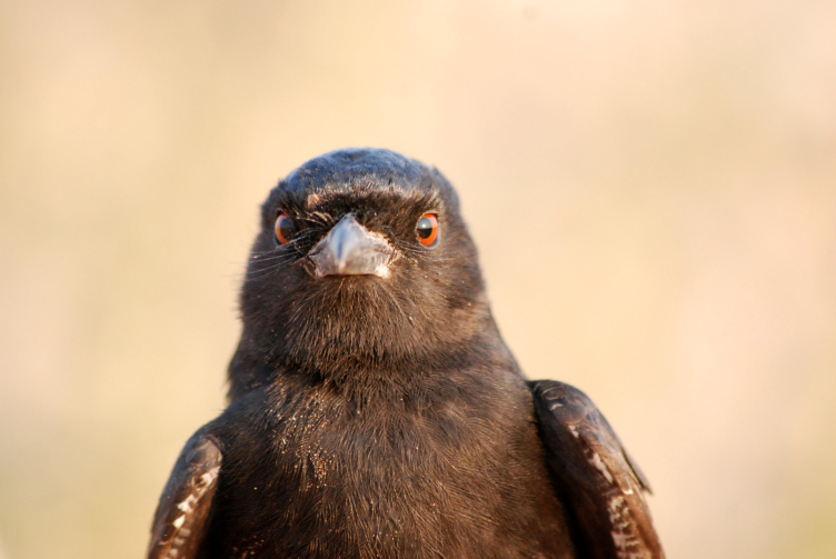 With its glossy black feathers, hooked beak, red eyes, and a forked-tail, the drongo is a devilish-looking bird renowned for alarming others, and even attacking predators many times its own size, including the formidable martial eagle. It has the reputation of being the neighbourhood watchdog among small ground-foraging birds and mammals.