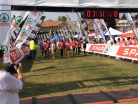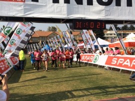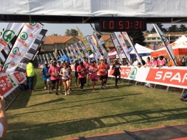 The first runner to cross the finish line in the 5km Spar Women’s Race, dressed in a pink t-shirt and tutu with no shoes, crossed the finish line at about 8.22am on 11 October. Her name is not known at this time.