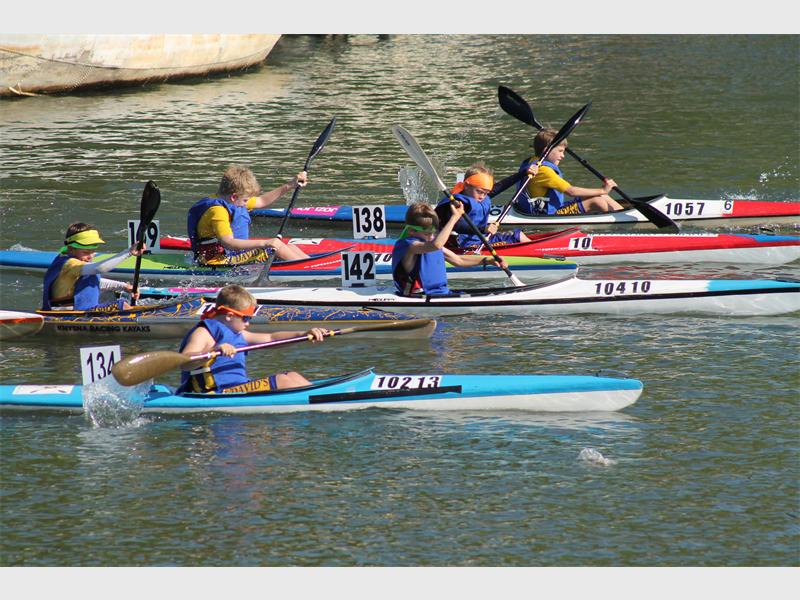 Canoeists, many of whom are from St David’s, give their all in the U8 race. Photo: Nicholas Zaal.