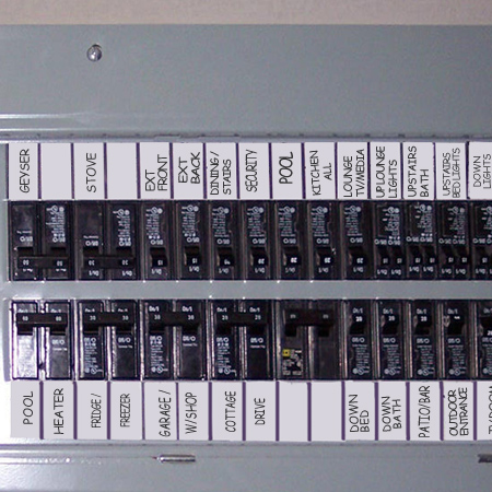 Having a labelled distribution board will save you time and money should a fault occur. Knowing which particular switch is tripping narrows down the time spent searching for a problem and will cut down on the cost of fault-finding in the event that you need to call a qualified electrician.