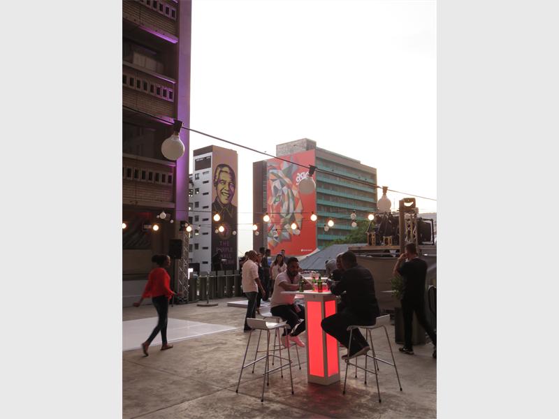 Guests on the balcony of the Neightbourgoods Market in Braamfontein were treated to KFC chicken, an open bar and even a candy bar. Once everyone had made their way up to the newly-opened bar, Thirteen, they were greeted with breathtaking views of Nelson Mandela Bridge and Johannesburg.