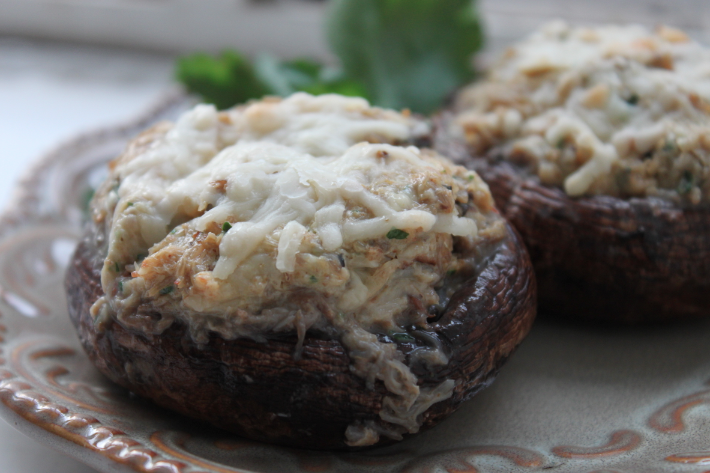 In a medium-sized bowl add the bread crumbs, Parmesan, garlic, butter, olive oil and parsley. Set aside some crumbs and Parmesan to sprinkle on top. Stir the mixture to blend. Remove the stems of the mushrooms. Stuff the mushroom caps with the crab mixture and place in a large baking dish or pan. Top each stuffed mushroom cap with bread crumbs and Parmesan (grated mozzarella optional). Bake in a preheated oven at 190° C for around 20 – 30 minutes or until the cheese on top has browned. Serve warm.