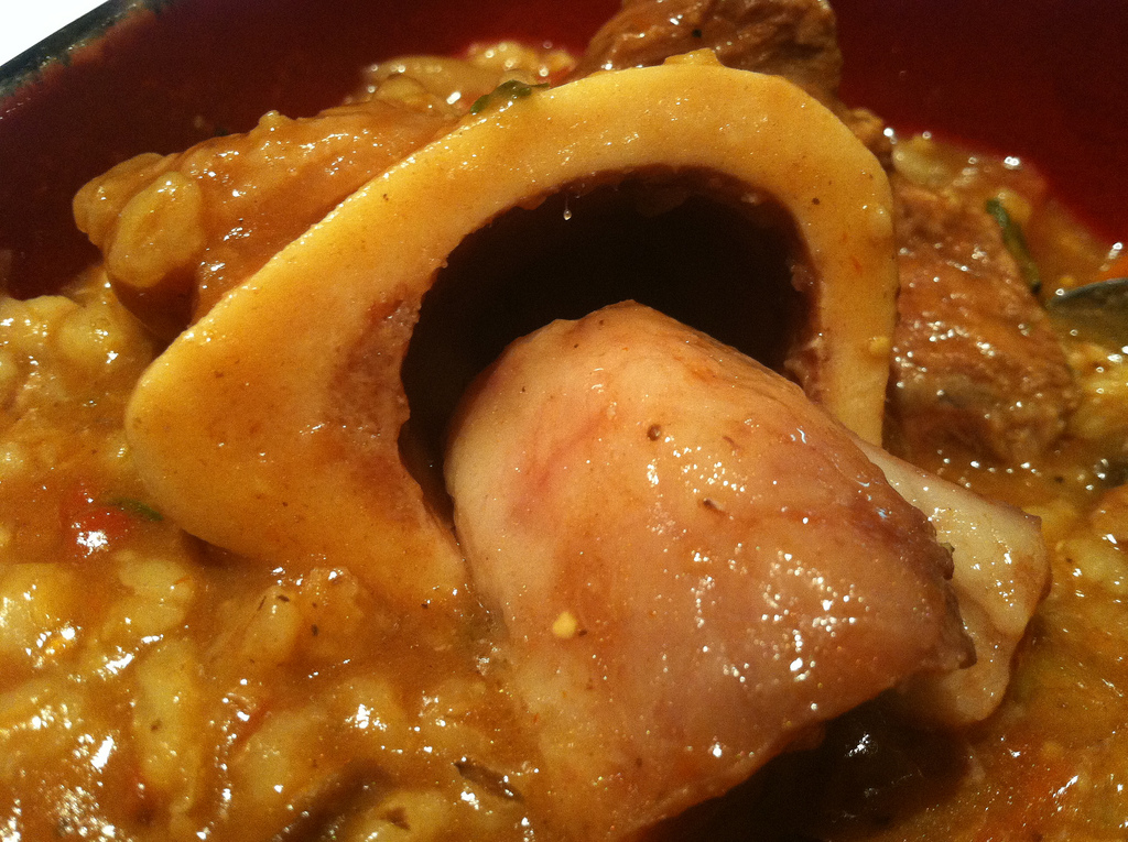 Fry onion, garlic and vegetables in the olive oil for about 7 minutes. Add thyme and tomato paste and mix in, add wine. Pour barley on top. Add stock, tomatoes and marrow bones. Cover and simmer on low for about an hour. Add salt and pepper. Serve with bruschetta.
