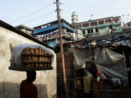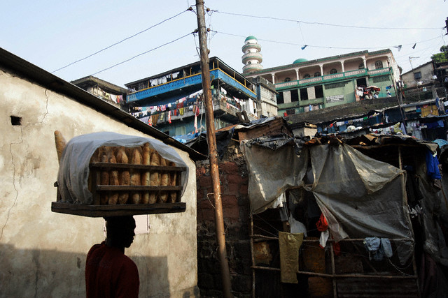A man carries on his head a tray of bread to be sold in Susan’s Bay, a slum in Freetown, Sierra Leone. Image by © Ann Johansson/Corbis
