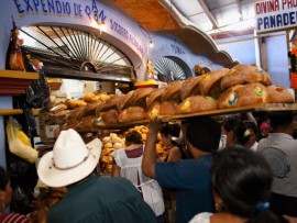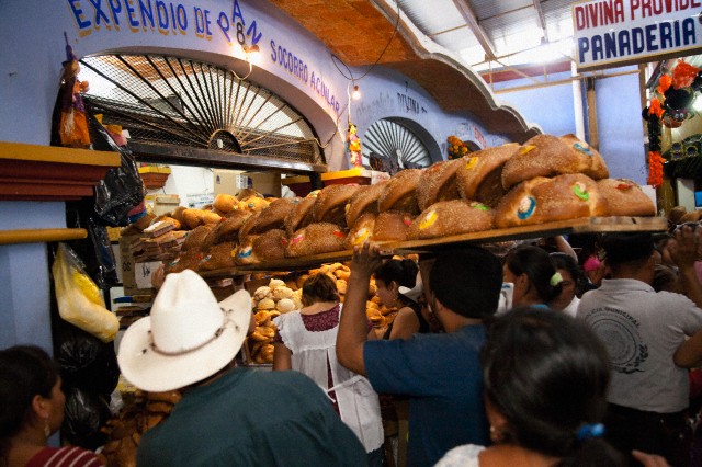 In Mexico, bread is a part of any occasion. Here is a man delivering special bread, pan de muertos, in crowded market during annual Day of the Dead celebration, Ocotlan, Mexico. Image by © John and Lisa Merrill/Corbis
