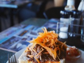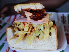 Kota is a proudly South African burger that contains chips, cheese and any toppings you can think of. Image from nearlybornfree.wordpress.com