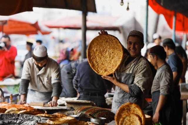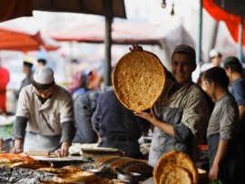 A young man sells a piece of freshly made naan bread at the market in Kuqa in the Tarim Basin in China. Image by © Lo Mak/Redlink/Corbis