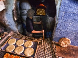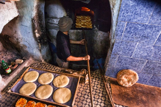 Baker cooking an everyday staple of flatbreads in front of his oven in Medina of Fes, Morocco Image by © Sébastien RABANY/Photononstop/Corbis