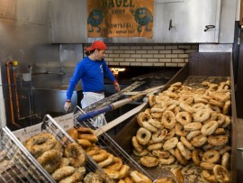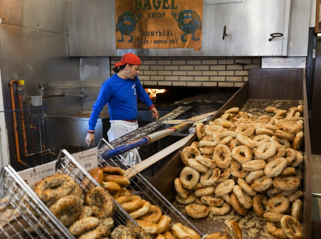 St-Viateur Bagel is a famous Montreal-style bagel bakery located in the neighbourhood of Mile End in the borough of Le Plateau Mont-Royal. Established in 1957 by Myer Lewkowicz, the bakery takes its name from its street, St-Viateur Street. The beigel is a bread product originating in Poland, traditionally shaped by hand into the form of a ring. Image by © Thierry Tronnel/Corbis