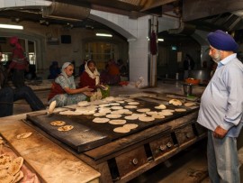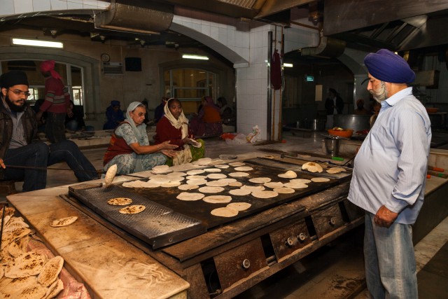 These women prepare Chapatis (an Unleavened Bread) for the evening meal offered to the hungry at Bangla Sahib Gurudwara Sikh Temple in India. Image by Rhapsode/Corbis