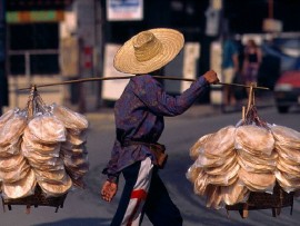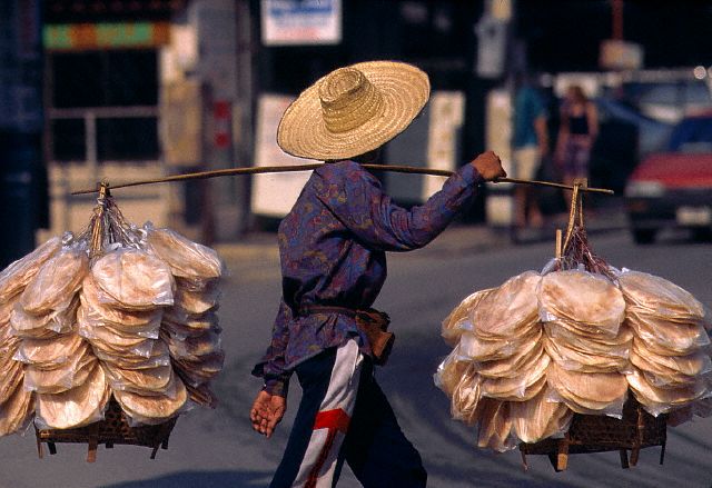 A street vendor laden with flatbread confidently crosses the streets with his delivery. Image by © Kevin R. Morris/Corbis