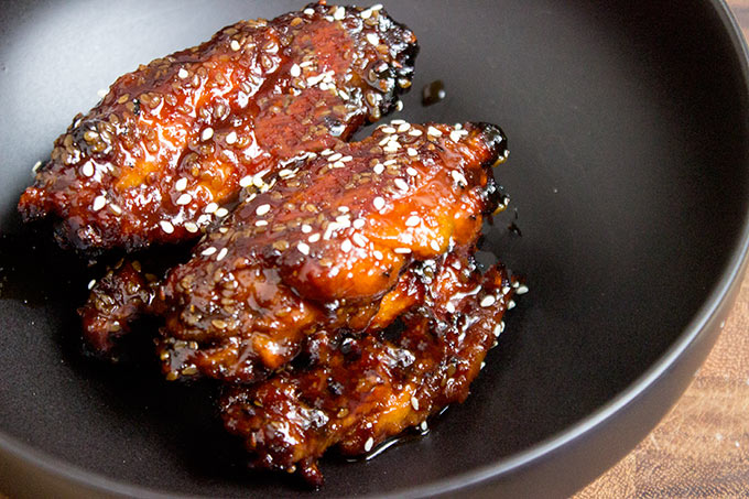 Preheat the oven to 220º C. Line a baking sheet with foil. Top with a cooling rack. Remove the chicken from the bag, reserving the marinade, and arrange the drumsticks on the cooling rack. Bake until the skin is caramelized and dark in spots, about 30 minutes.