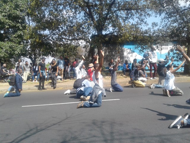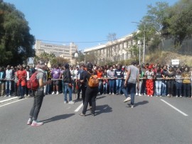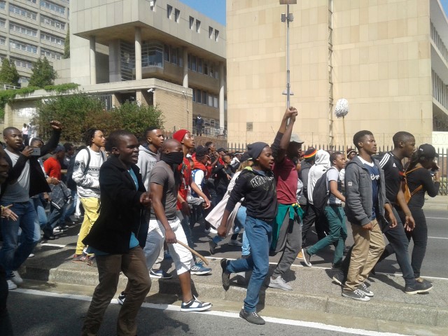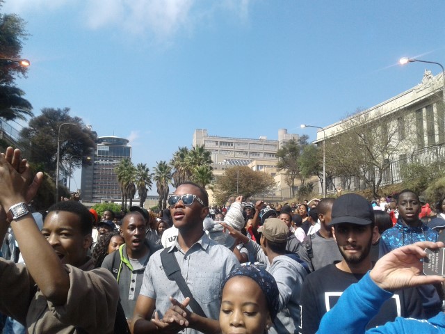 Upon arrival, the students were greeted in song by an additional 500 like-minded students ready to join the protest and march back to main campus where they would assemble at Solomon Mahlangu House.