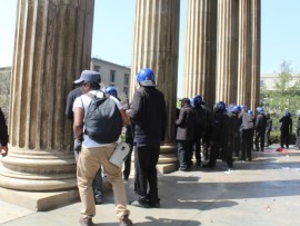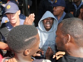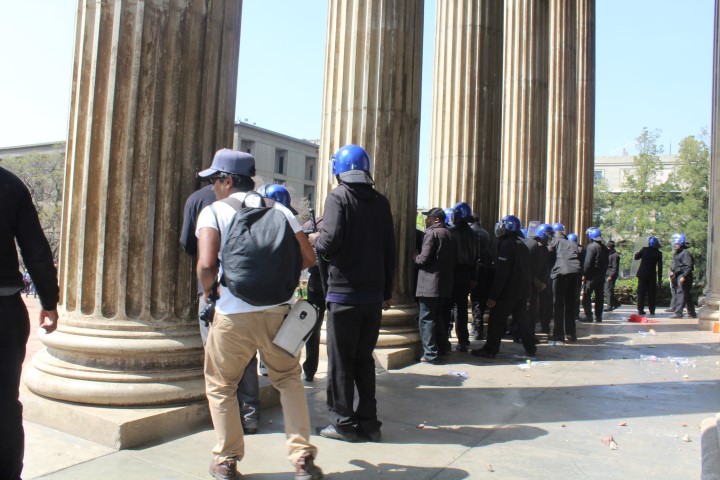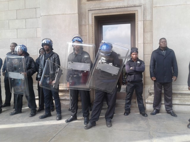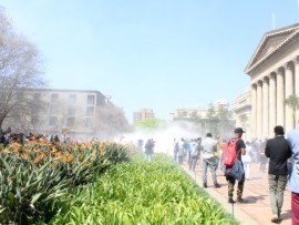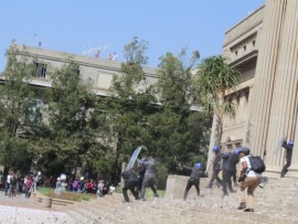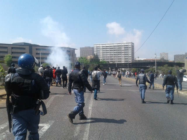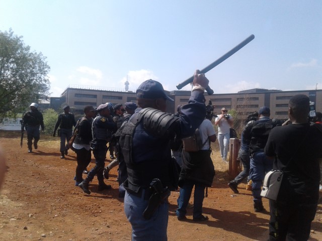 However, riot police had barricaded the entrance to Solomon Mahlangu House resulting in a crossfire of rubber bullets and a hail of rocks thrown at opposing parties who both suffered injuries.