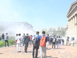 Attempting to deter the protesting students from marching to the education campus, police threw stun grenades on the corner of Empire and St Andrews roads but the infuriated and adamant group marched on through the bangs and smoke.