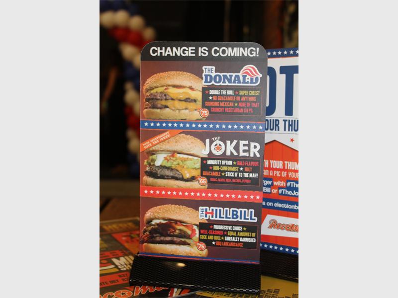 “The Donald is a double-beef smash, double cheese and cheese sauce. It’s double the bull and super cheesy; in the Hillary we’ve put in chicken smash, beef smash, bacon and we have tried to make it more because with the Hillary and Bill scenario one will never know the truth,” said Altriche.