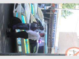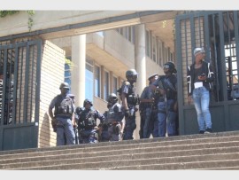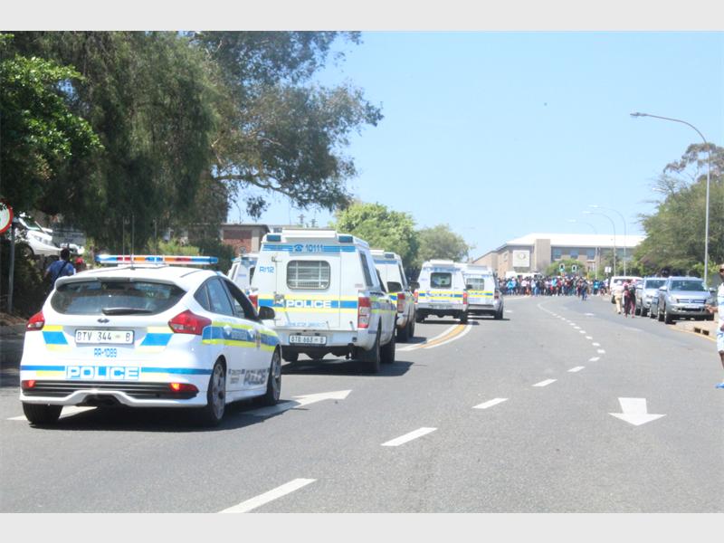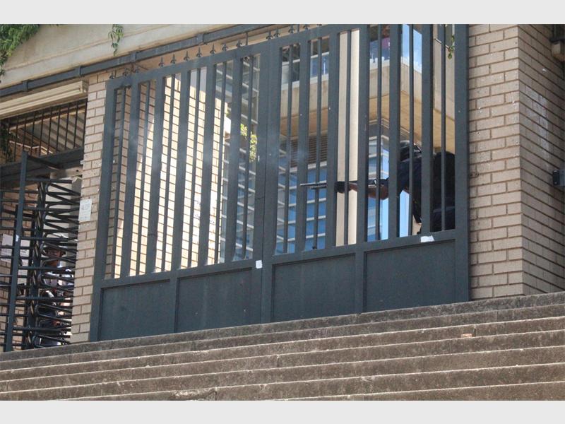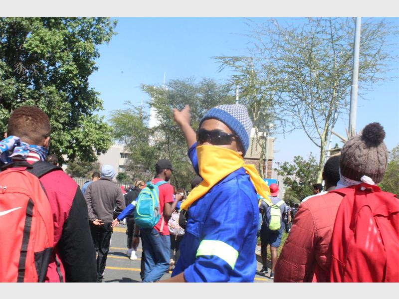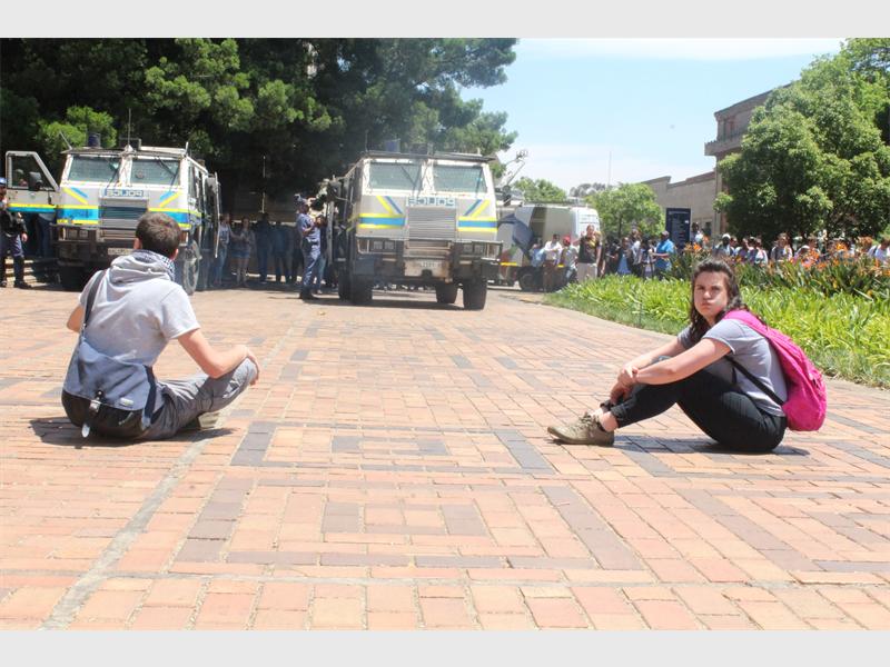 Police, who were camped under a tree, tried to bring in two Nyalas onto the courtyard but were stopped by students who sat in their way, and police then retaliated by throwing the first few stun grenades for the day, one more student was arrested.