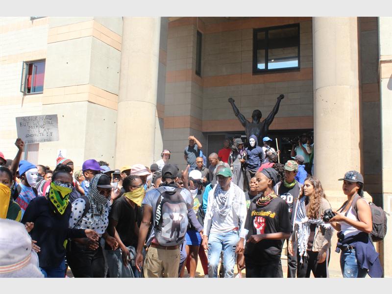 When students congregated on the stairs of the Great Hall, a group of students began pelting stones as the private security guards who were blocking the entrance to Solomon Mahlangu House. Two private security guards threw stones back at the students.