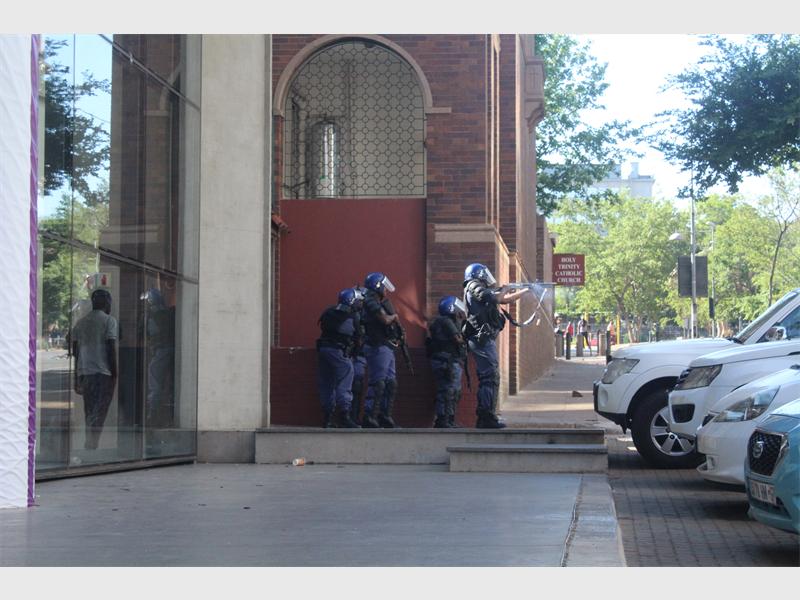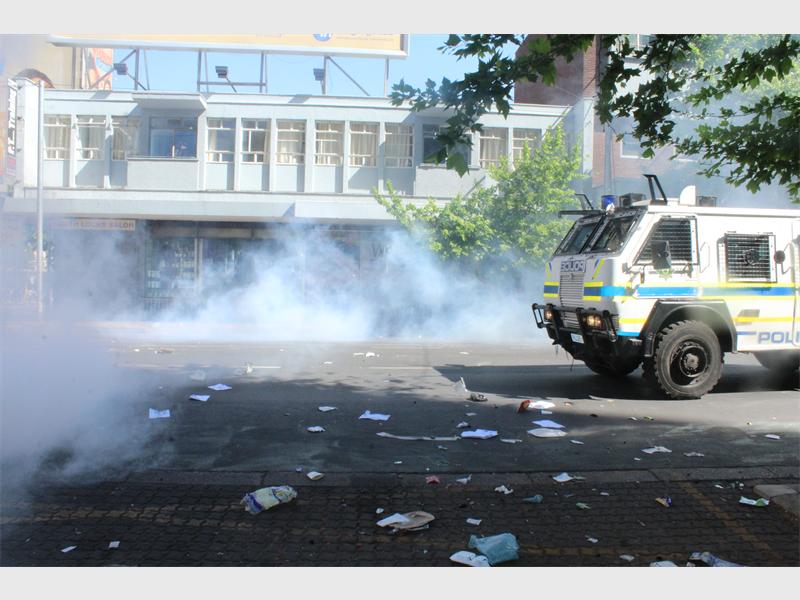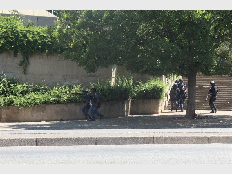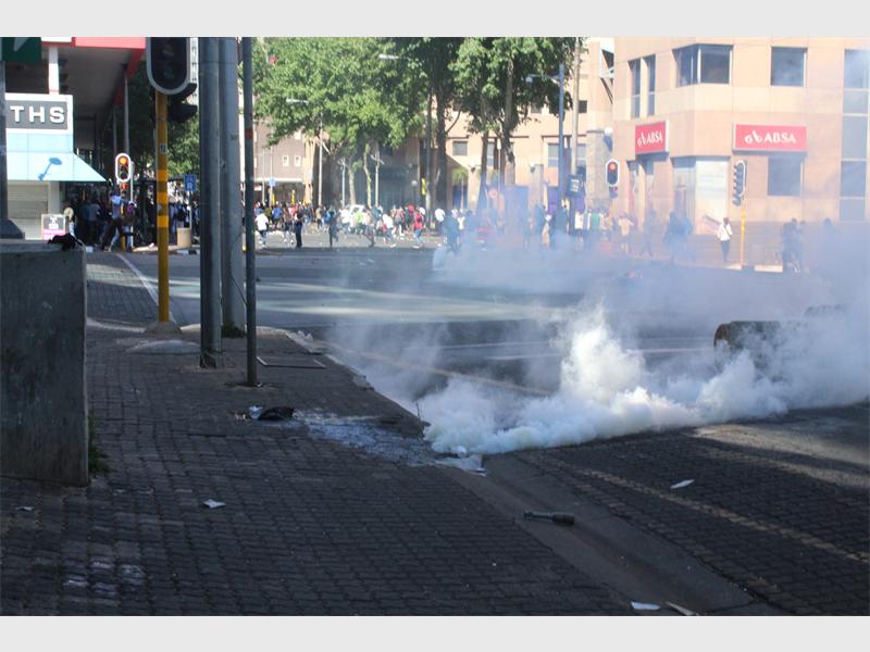 Chaos ensued on Wits main campus as students openly threw stones at police who retaliated with more stun grenades, tear gas and rubber bullets. Students ran further back into the east campus where they were blocked by a gate whilst police used a water cannon to try and disperse the students who ran off campus as the gate behind them opened, letting them spill into the streets of Braamfontein where havoc reigned for several hours. Police then called for more police officers.