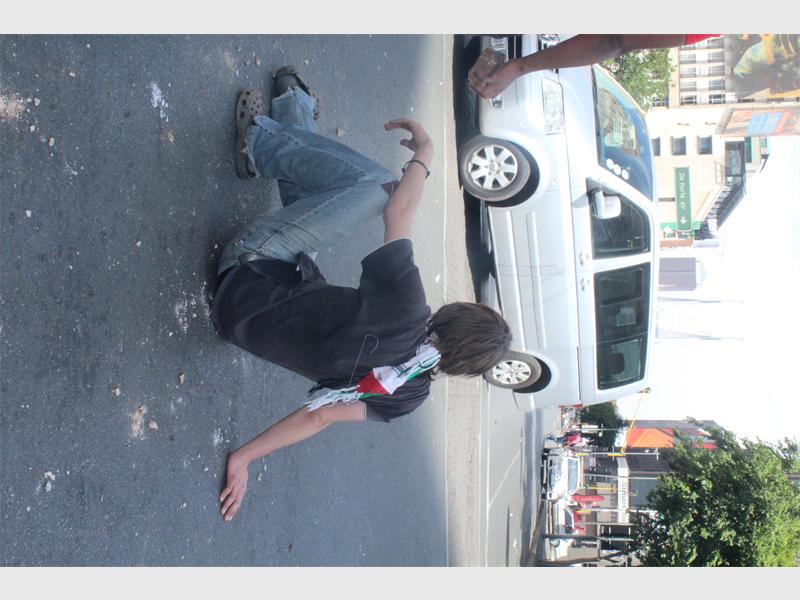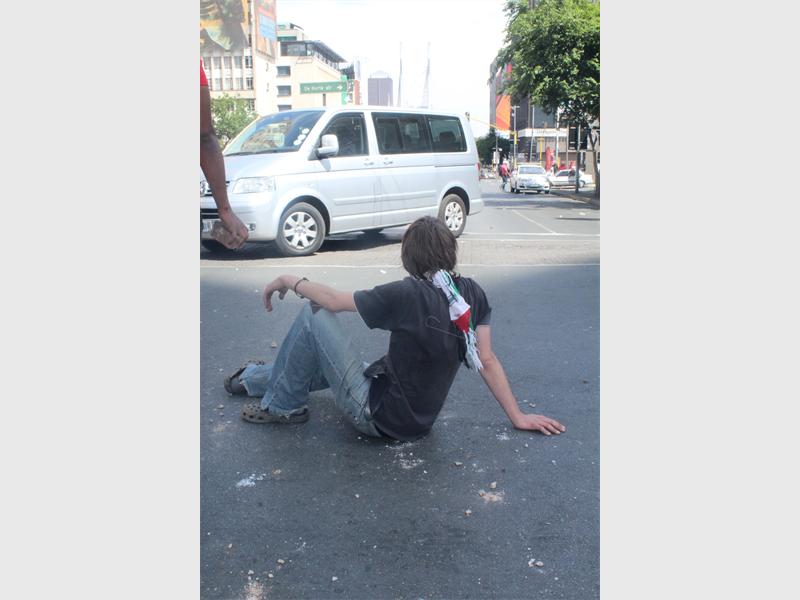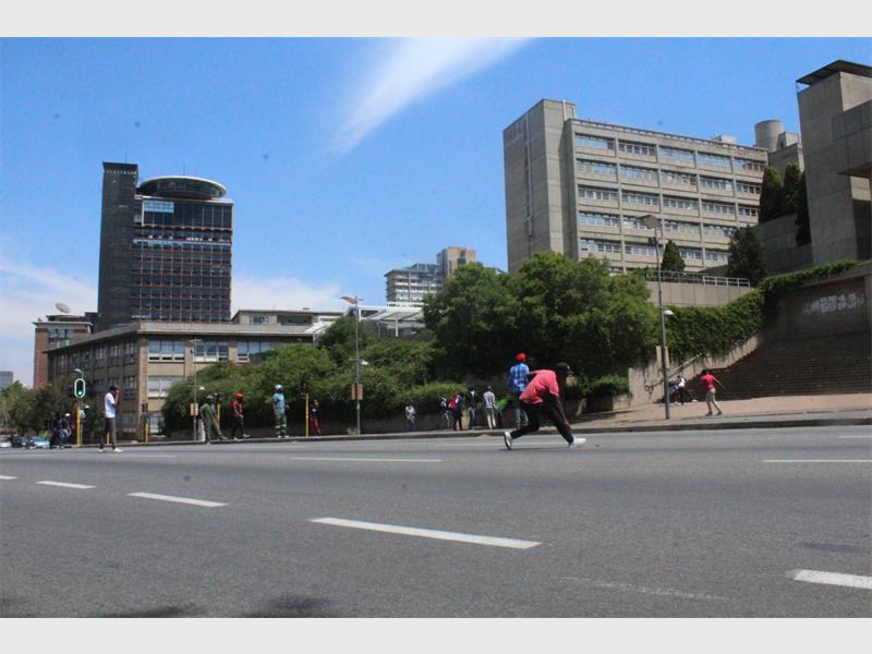 As police continued to shoot rubber bullets at students through the gate on Jan Smuts Avenue, traffic was brought to a standstill as motorists turned back onto the one-way lane, fearing for their lives as angry students continued to throw stones at police who were now randomly shooting at any moving person. Students then broke the stone dustbins into smaller pieces and used the stones to pelt the police.