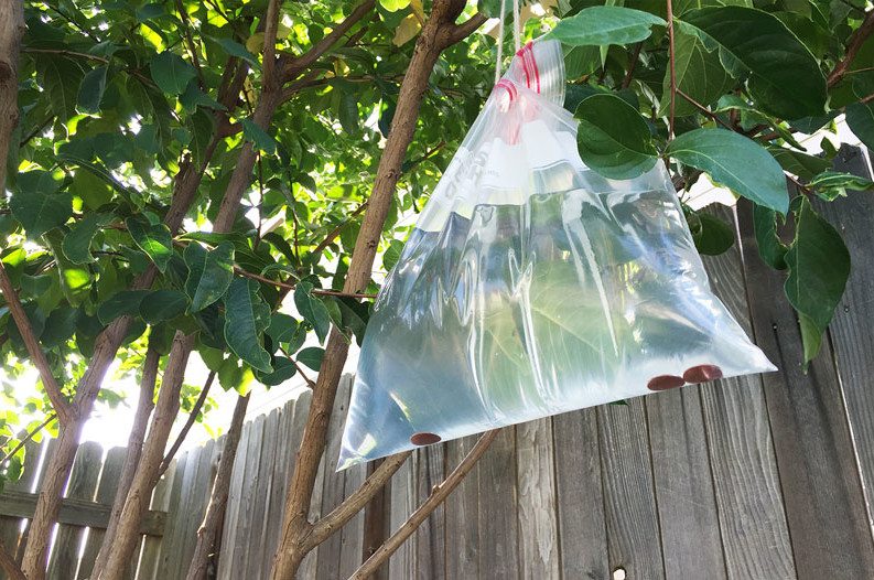 Mix two or three cups of water with salt and lime juice. Pour the mixture into a Ziploc bag until it’s nearly full. Add some coins before sealing it. The mixture is used to help keep the coins shiny. Hang the bag up using a paper clip. Bend the clip outward and slip it through the top of the bag, then attach it to some string. You can hang more of these bags to cover a larger area.