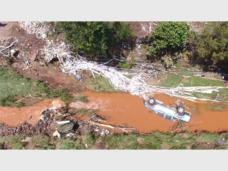 DISASTER: On 9 November one of the week’s flash floods forced car owners from their vehicles to a place of safety as they watched their possessions rise to the surface of the high waters. A reader of the local community newspapers was even able to record drone footage of a double cab that had been washed into a ditch.