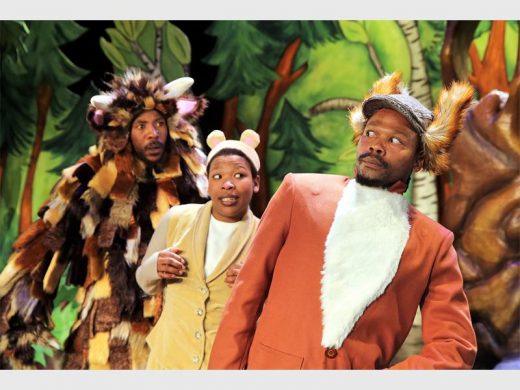 Ayanda Nondlwana as The Gruffalo, Nombasa Ngoqo as the mouse and Sisonke Yafele as the fox in the production of The Gruffalo.