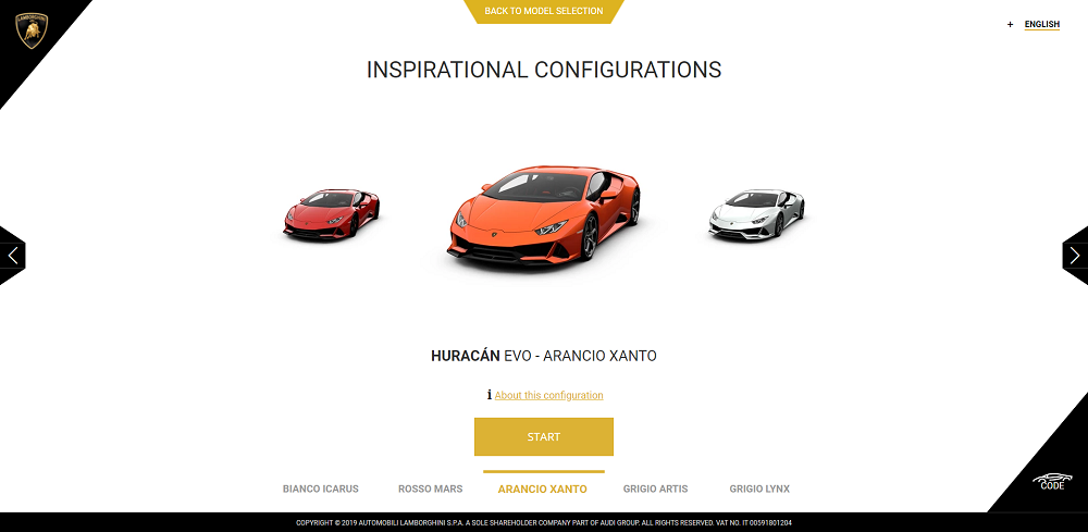 Unfortunately, I don’t have many millions of Rands to spend on a new Lamborghini but, I do have an imagination and as I mentioned earlier I have decided to build my own Lamborghini using the Lamborghini Configurator (give it a try). The website is easy to use and I very quickly managed to select the Huracan Evo. I opted for Arancio Xanto paint, or orange if you will. Once that is done you click on ‘start’ and here you get to build the car of your dreams.